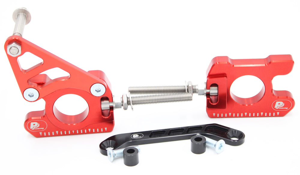 This set of chain clamps for Yamaha R1 is equipped with a brake caliper holder. This holds the entire brake caliper even when you pull the rear wheel out. Nothing will slip or fall apart.