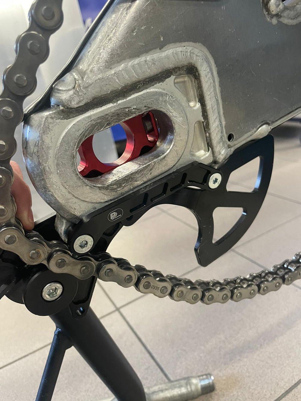 The set also includes a bracket on the inside of the swingarm to guide the wheel back when mounting.