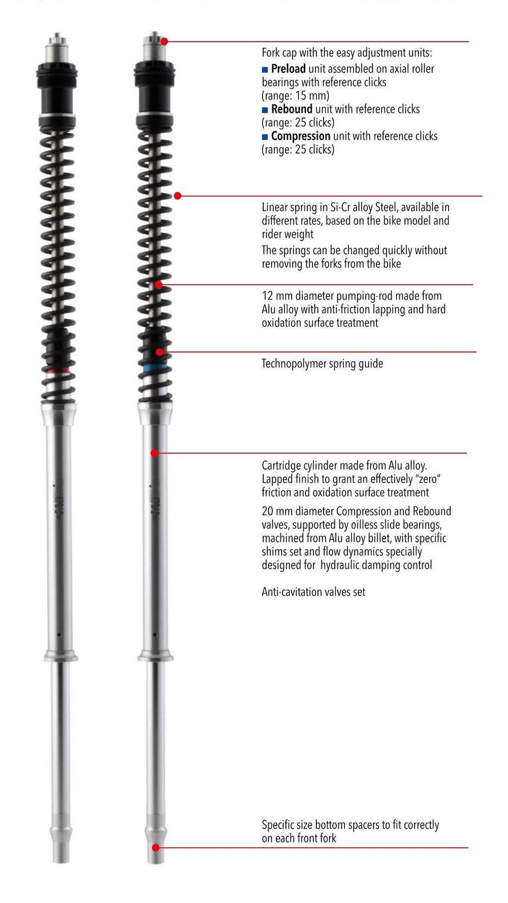 It is an asymmetrical hydraulic cartridge kit that completely replace the original internals of conventional non-adjustable forks converting them in fully-adjustable ones as in a sports fork type.