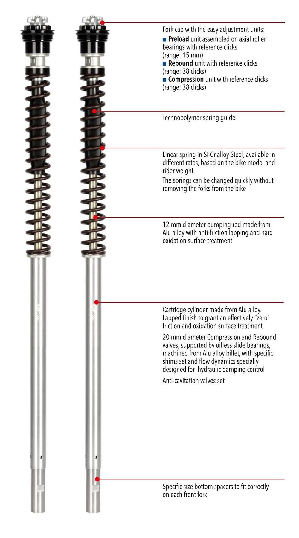 Fully adjustable on spring Preload and feature separate asymmetrical Compression and Reboundadjustment, the cartridge is provided using the innovative “quad-valve system” that avoids the risk of fluid cavitation.