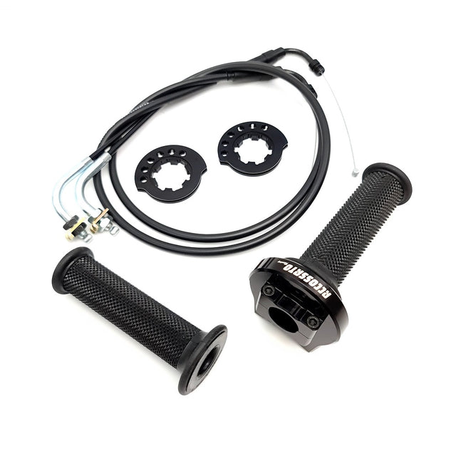 The kit also features three interchangeable internal CAMs (40 mm, 43 mm, and 45 mm), all CNC‑machined from Ergal. These allow you to fine‑tune throttle stroke and responsiveness — bigger CAM diameters deliver quicker throttle action and increased grip rotation.